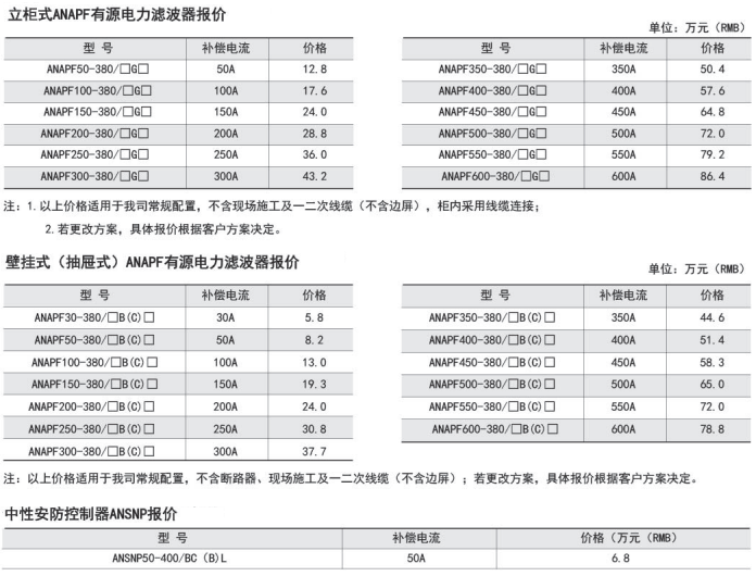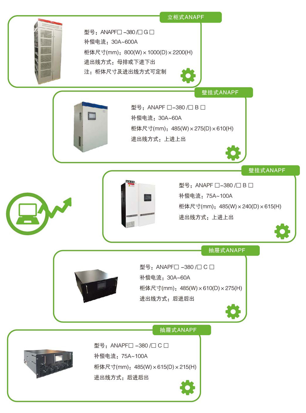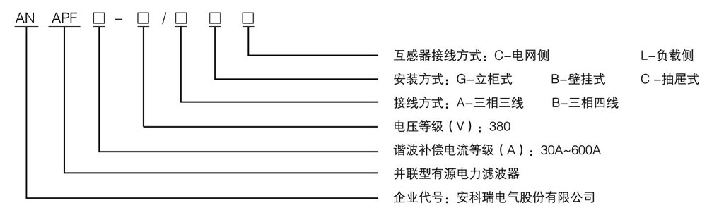 適用于并聯(lián)在含諧波負載的低壓配電系統(tǒng)中,能夠?qū)討B(tài)變化的諧波電流進行快速實時的跟蹤和補償。訂貨范例: