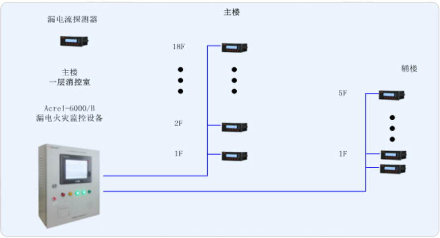 針對(duì)本項(xiàng)目的性質(zhì)及配電結(jié)構(gòu),現(xiàn)針對(duì)其主樓(18層)、輔樓(5層),兩棟樓設(shè)計(jì)一套電氣火災(zāi)監(jiān)控系統(tǒng)。在主樓和輔樓的樓層配電箱的進(jìn)線端安裝漏電流探測(cè)器,由此來(lái)實(shí)時(shí)監(jiān)測(cè)變電所內(nèi)重要回路的漏電流,以確保變電所配電系統(tǒng)的電氣安全。