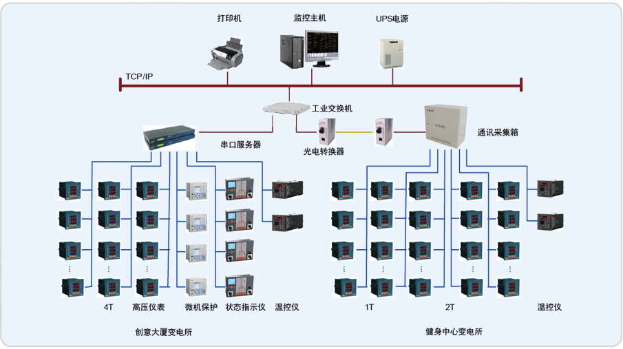 本項目監控范圍為健身中心變電所的T1、T2變壓器的低壓進線柜、聯絡 柜、饋線柜和創意大廈變電所的T3、T4變壓器的低壓進線柜、聯絡柜、饋線柜及高壓側儀表進行遠程實時監控和電能管理直線距離約230米。