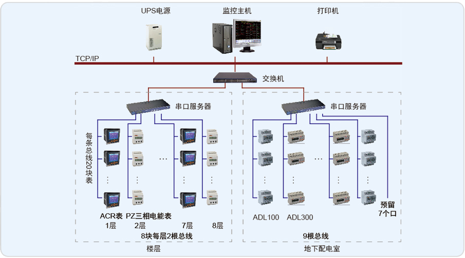 黑龍江省大豆乳品研發(fā)中心電能管理系統(tǒng)的監(jiān)控范圍為地下二層配電間采用的ACR網(wǎng)絡(luò)電力儀表和PZ三相電能表共182臺,地上八樓層配電箱采用的ADL100和ADL300導(dǎo)軌式電能表共321塊。系統(tǒng)應(yīng)用分布式網(wǎng)絡(luò)結(jié)構(gòu),采用32根屏蔽雙絞線將設(shè)備層的儀表連接至通訊層的兩臺16口串口服務(wù)器,又通過TCP/IP將數(shù)據(jù)上傳至監(jiān)控層的工業(yè)計(jì)算機(jī)進(jìn)行采集、分析、存儲。