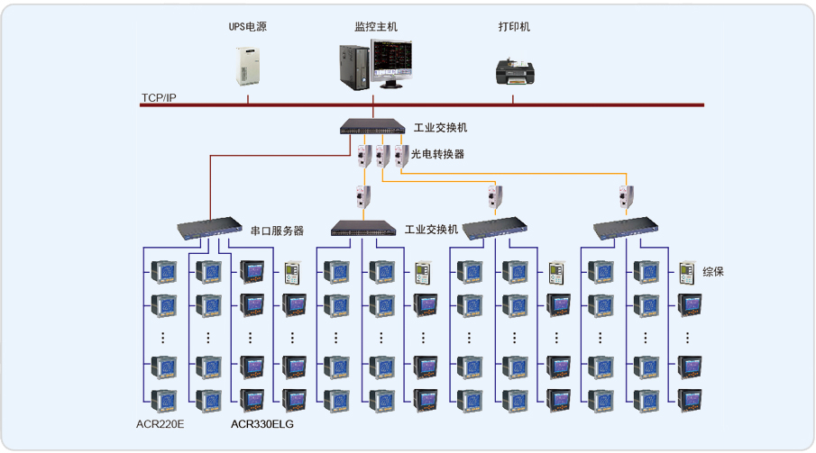 藍礬化工配電系統(tǒng)管理監(jiān)控系統(tǒng)主要實現(xiàn)對藍礬化工的主控配電室、消防配電室、造氣0.4KV配電室開關(guān)柜內(nèi)安裝的213只ACR120EL、11只ACR330ELG、80只電力儀表 、4只綜保的監(jiān)測和控制。系統(tǒng)通過安裝在工廠電網(wǎng)中主要受電點和樞紐配電柜中的電能監(jiān)測儀表采集到配電網(wǎng)的各項電力參數(shù)信號,再將信號轉(zhuǎn)換為數(shù)據(jù)傳輸?shù)接嬎銠C中,計算機對數(shù)據(jù)進行存儲、計算和分類存儲到數(shù)據(jù)庫中,然后通過計算軟件將電能以報表、圖表的形式進行展示。電能管理人員可通過計算機看到電能的輸入、傳輸、消耗的全過程。