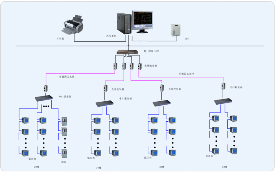 本次項目為制造工程技術大樓的電力監控系統。通過利用原本已安裝的智能儀表,將原非智能儀表更換為智能儀表。通過組建系統網絡,實時監測變電所內各個回路的電流、電壓、功率、開關狀態等電參量,由此達到變電所少人值守或無人值守的智能化管理。