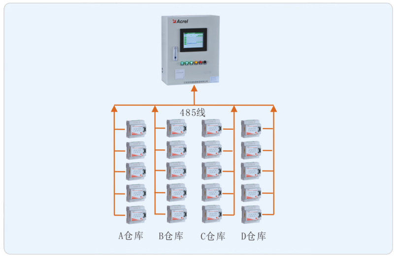 系統(tǒng)采用安科瑞消防電源監(jiān)控系統(tǒng),該系統(tǒng)主要采用分層分布式網(wǎng)絡(luò)結(jié)構(gòu),系統(tǒng)結(jié)構(gòu)為:站控管理層、網(wǎng)絡(luò)通訊層和現(xiàn)場(chǎng)設(shè)備層。其中廣陳第三方電子商務(wù)平臺(tái)托管產(chǎn)業(yè)基地現(xiàn)場(chǎng)設(shè)備分布為A、B、C、D倉(cāng)庫(kù)以及綜合辦公用房消防配電回路。該系統(tǒng)監(jiān)控所有消防配電柜內(nèi)消防回路雙電源的實(shí)時(shí)運(yùn)行狀態(tài),如有異常會(huì)后臺(tái)報(bào)警。所有監(jiān)測(cè)模塊通過(guò)485總線鋪設(shè)至消防控制室,消防電源監(jiān)控主機(jī)從而完成對(duì)監(jiān)測(cè)模塊的采集并監(jiān)控。