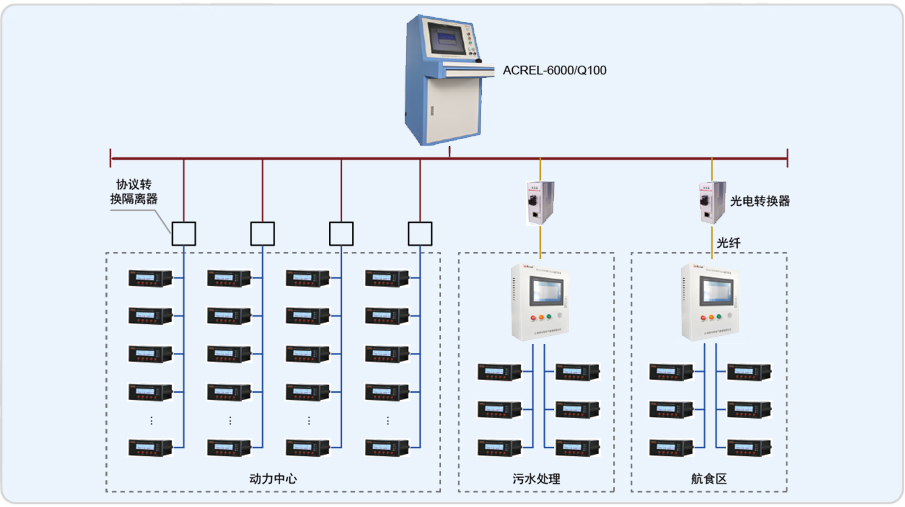 系統(tǒng)采用分層分布式結(jié)構(gòu),站控管理層及現(xiàn)場設(shè)備層,站控管理層設(shè)備為我公司一套琴臺(tái)式電氣火災(zāi)監(jiān)控設(shè)備及2套壁掛式電氣火災(zāi)監(jiān)控設(shè)備,對分散在各區(qū)域內(nèi)的ARCM剩余電流式電氣火災(zāi)監(jiān)控裝置進(jìn)行遙測、遙信,實(shí)現(xiàn)監(jiān)控與管理。各區(qū)域內(nèi)探測器采用RS485總線直接接入琴臺(tái)式電氣火災(zāi)監(jiān)控設(shè)備。系統(tǒng)采用Acrel-6000電氣火災(zāi)監(jiān)控系統(tǒng),實(shí)現(xiàn)對被保護(hù)電氣線路的實(shí)時(shí)監(jiān)測。