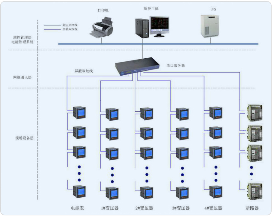 系統(tǒng)應(yīng)通過多功能的電力監(jiān)控裝置、通訊網(wǎng)絡(luò)和計算機軟件,實現(xiàn)醫(yī)院內(nèi)供配電系統(tǒng)在運行過程中的數(shù)據(jù)采集、運行監(jiān)視、事故預(yù)警、事故記錄和分析、電能質(zhì)量檢測、三相不平衡監(jiān)視、繼電保護等,完成醫(yī)院的安全供電、用電管理、設(shè)備管理和運行管理。系統(tǒng)由主控層、通訊管理層和現(xiàn)場控制層構(gòu)成。系統(tǒng)要求盡量減少集中采集數(shù)據(jù)的裝置以保證系統(tǒng)的通訊可靠性。