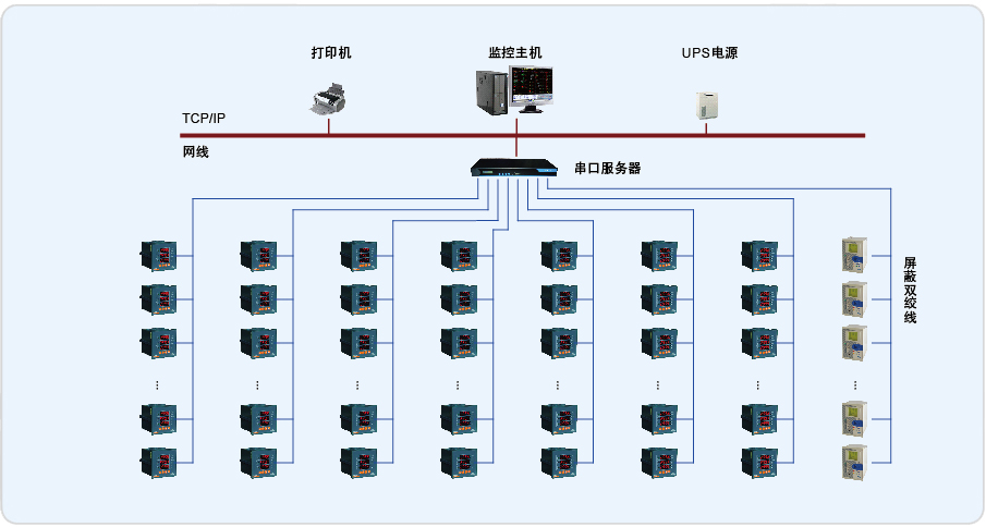 整個(gè)系統(tǒng)采用分布式結(jié)構(gòu),網(wǎng)球中心整個(gè)配電系統(tǒng)分為高低壓兩個(gè)部分,分別位于高壓變電所及低壓變電所,電力監(jiān)控系統(tǒng)位于配電室旁邊的電力監(jiān)控值班室。其中高壓配電室共計(jì)5個(gè)回路,分別為10KV進(jìn)線1、10KV進(jìn)線2、1#變壓器出線、2#變壓器出線及聯(lián)絡(luò);低壓變電所共計(jì)145個(gè)回路,分別采用ACR220E及ACR220ELH,其中ACR220ELH安裝于低壓進(jìn)線及發(fā)電機(jī)進(jìn)線中。本系統(tǒng)網(wǎng)球中心電力監(jiān)控?cái)?shù)據(jù)均通過奧體中心內(nèi)部局域網(wǎng),將數(shù)據(jù)通過Modbus TCP的方式上傳至奧體中心數(shù)據(jù)中心,同時(shí)在廣州市供電局10樓設(shè)置電力監(jiān)控系統(tǒng)工作站,數(shù)據(jù)通過網(wǎng)絡(luò)公司局域網(wǎng),通過廣東省104規(guī)約傳輸至供電局調(diào)度中心。