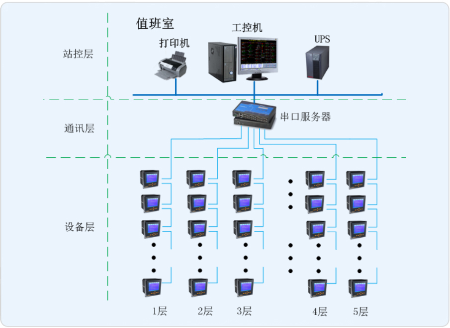 本項(xiàng)目是為羅店鎮(zhèn)市民服務(wù)中心樓層配電部分設(shè)計(jì)的電能管理系統(tǒng),監(jiān)控范圍為8層樓內(nèi)的多功能儀表。現(xiàn)場(chǎng)多功能儀表通過總線接入值班室采集器,再將通過采集器連接到監(jiān)控主機(jī),從而在監(jiān)控主機(jī)上實(shí)現(xiàn)總線上儀表與監(jiān)控主機(jī)的數(shù)據(jù)連通。通過Acrel-3000電能管理系統(tǒng)對(duì)樓層用電環(huán)節(jié)進(jìn)行記錄與統(tǒng)計(jì),借助計(jì)算機(jī)輔助手段進(jìn)行集抄,節(jié)省人工成本。